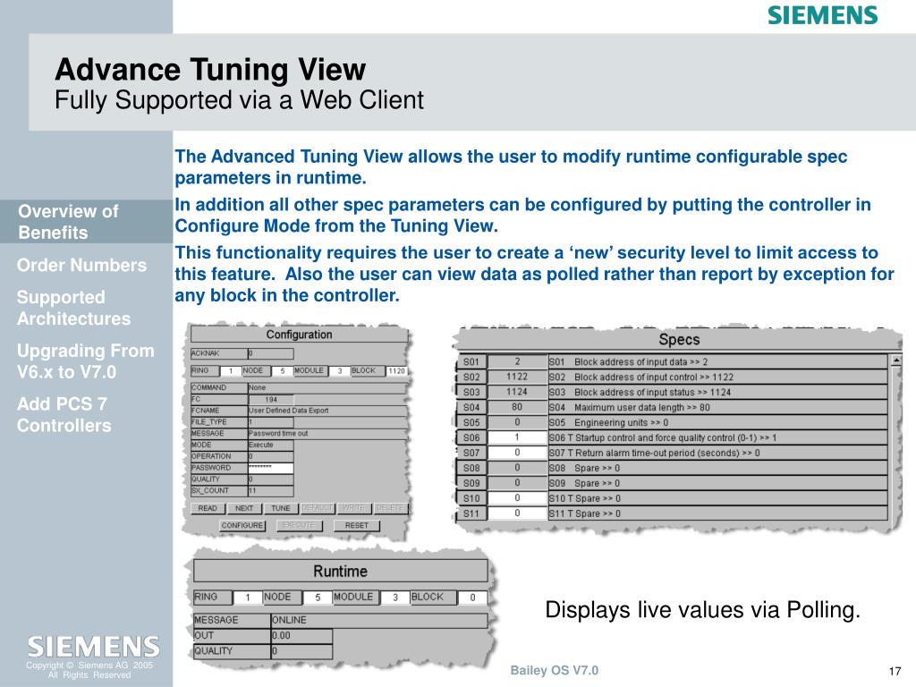 Advance Tuning ViewFully Supported via a Web Client • The Advanced Tuning View allows the user to modify runtime configurable spec parameters in runtime. • In addition all other spec parameters can be configured by putting the controller in Configure Mode from the Tuning View. • This functionality requires the user to create a ‘new’ security level to limit access to this feature. Also the user can view data as polled rather than report by exception for any block in the controller. Overview of Benefits Displays live values via Polling. Bailey OS V7.0