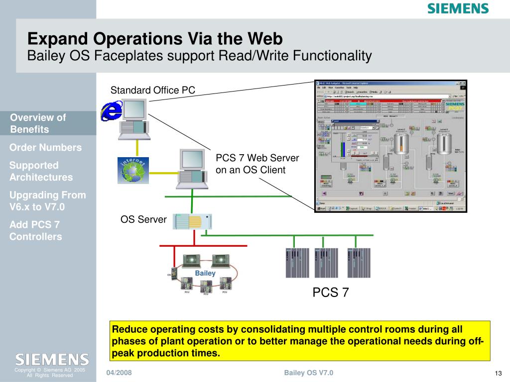 Bailey Expand Operations Via the WebBailey OS Faceplates support Read/Write Functionality Standard Office PC Overview of Benefits PCS 7 Web Server on an OS Client OS Server PCS 7 Reduce operating costs by consolidating multiple control rooms during all phases of plant operation or to better manage the operational needs during off-peak production times. Bailey OS V7.0