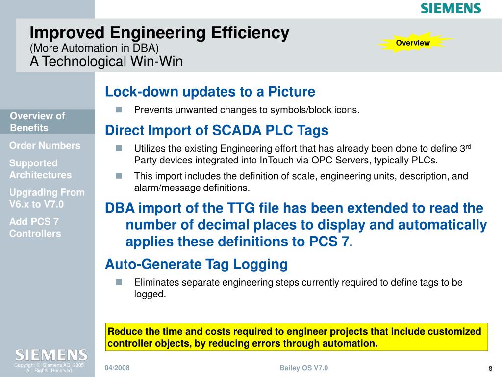 Improved Engineering Efficiency (More Automation in DBA)A Technological Win-Win Overview • Lock-down updates to a Picture • Prevents unwanted changes to symbols/block icons. • Direct Import of SCADA PLC Tags • Utilizes the existing Engineering effort that has already been done to define 3rd Party devices integrated into InTouch via OPC Servers, typically PLCs. • This import includes the definition of scale, engineering units, description, and alarm/message definitions. • DBA import of the TTG file has been extended to read the number of decimal places to display and automatically applies these definitions to PCS 7. • Auto-Generate Tag Logging • Eliminates separate engineering steps currently required to define tags to be logged. Overview of Benefits Reduce the time and costs required to engineer projects that include customized controller objects, by reducing errors through automation. Bailey OS V7.0
