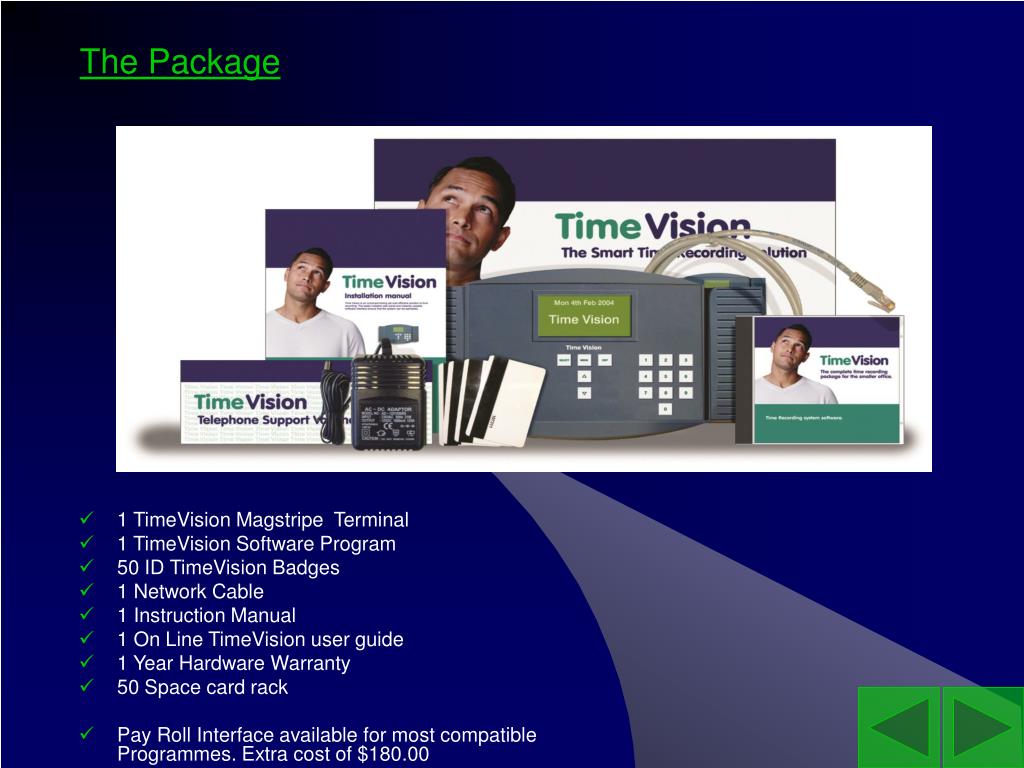 The Package only • 1 TimeVision Magstripe Terminal • 1 TimeVision Software Program • 50 ID TimeVision Badges • 1 Network Cable • 1 Instruction Manual • 1 On Line TimeVision user guide • 1 Year Hardware Warranty • 50 Space card rack • Pay Roll Interface available for most compatible Programmes. Extra cost of $180.00