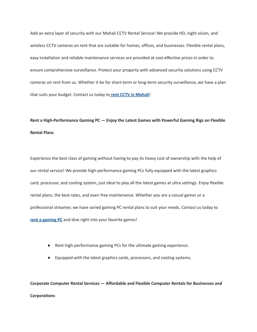Add an extra layer of security with our Mohali CCTV Rental Service! We provide HD, night vision, and wireless CCTV cameras on rent that are suitable for homes, offices, and businesses. Flexible rental plans, easy installation and reliable maintenance services are provided at cost-effective prices in order to ensure comprehensive surveillance. Protect your property with advanced security solutions using CCTV cameras on rent from us. Whether it be for short-term or long-term security surveillance, we have a plan that suits your budget. Contact us today to rent CCTV in Mohali! Rent a High-Performance Gaming PC — Enjoy the Latest Games with Powerful Gaming Rigs on Flexible Rental Plans Experience the best class of gaming without having to pay its heavy cost of ownership with the help of our rental service! We provide high-performance gaming PCs fully equipped with the latest graphics card, processor, and cooling system, just ideal to play all the latest games at ultra settings. Enjoy flexible rental plans, the best rates, and even free maintenance. Whether you are a casual gamer or a professional streamer, we have varied gaming PC rental plans to suit your needs. Contact us today to rent a gaming PC and dive right into your favorite games! ● Rent high-performance gaming PCs for the ultimate gaming experience. ● Equipped with the latest graphics cards, processors, and cooling systems. Corporate Computer Rental Services — Affordable and Flexible Computer Rentals for Businesses and Corporations