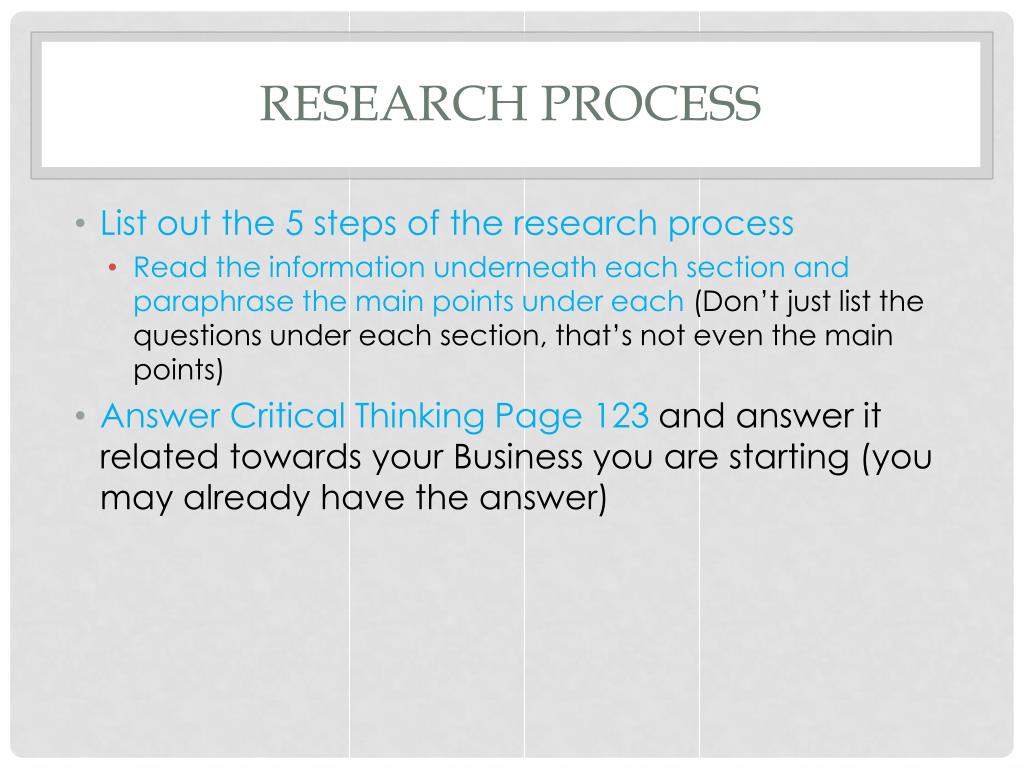 Research process • List out the 5 steps of the research process • Read the information underneath each section and paraphrase the main points under each (Don’t just list the questions under each section, that’s not even the main points) • Answer Critical Thinking Page 123 and answer it related towards your Business you are starting (you may already have the answer)