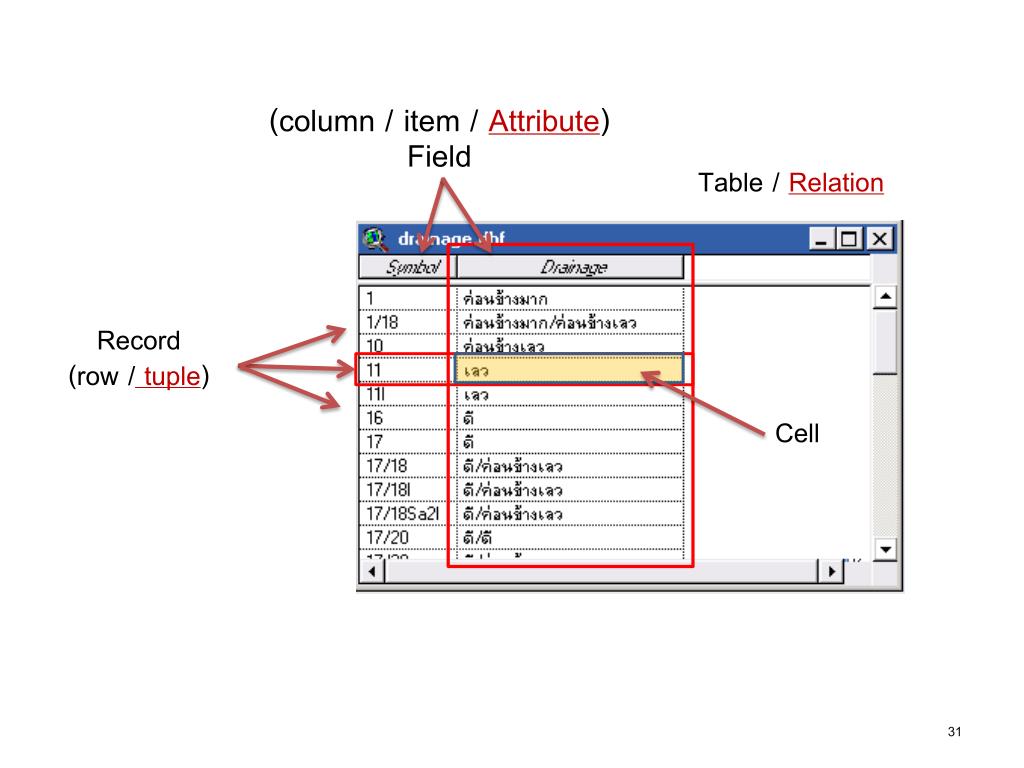 องค์ประกอบของตารางข้อมูลองค์ประกอบของตารางข้อมูล (column / item / Attribute) Field Table / Relation Record (row /tuple) Cell คำศัพท์ที่ใช้ใน Relational Database Management System Attribute data ซึ่งอาจจะเรียกอีกอย่างหนึ่งว่า Attribute Table