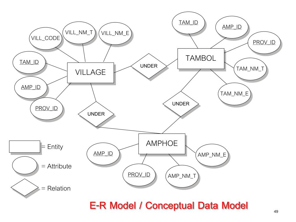 TAM_ID AMP_ID VILL_NM_T VILL_NM_E VILL_CODE PROV_ID TAMBOL TAM_ID UNDER TAM_NM_T VILLAGE AMP_ID TAM_NM_E UNDER PROV_ID UNDER AMPHOE = Entity AMP_ID AMP_NM_E = Attribute PROV_ID AMP_NM_T = Relation E-R Model / Conceptual Data Model