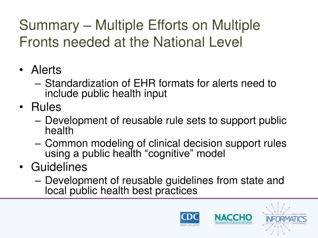 Summary – Multiple Efforts on Multiple Fronts needed at the National Level • Alerts • Standardization of EHR formats for alerts need to include public health input • Rules • Development of reusable rule sets to support public health • Common modeling of clinical decision support rules using a public health “cognitive” model • Guidelines • Development of reusable guidelines from state and local public health best practices