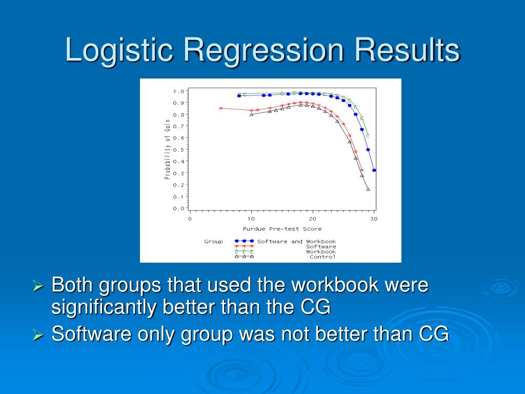 Logistic Regression Results • Both groups that used the workbook were significantly better than the CG • Software only group was not better than CG