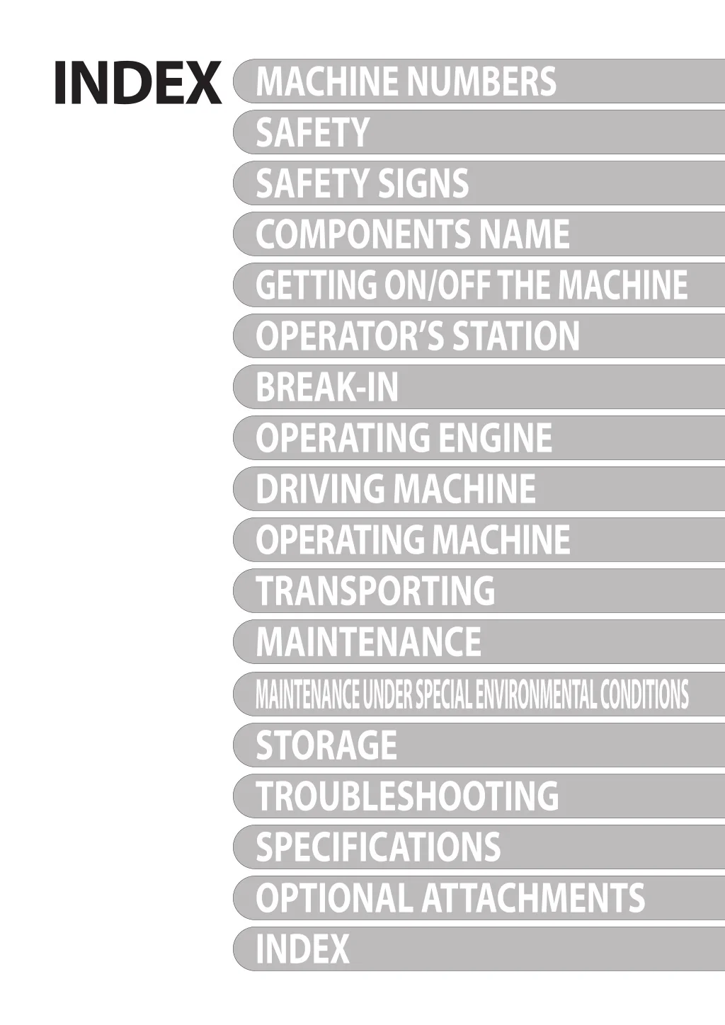 INDEX MACHINE NUMBERS SAFETY SAFETY SIGNS COMPONENTS NAME GETTING ON/OFF THE MACHINE OPERATOR’S STATION BREAK-IN OPERATING ENGINE DRIVING MACHINE OPERATING MACHINE TRANSPORTING MAINTENANCE MAINTENANCE UNDER SPECIAL ENVIRONMENTAL CONDITIONS STORAGE TROUBLESHOOTING SPECIFICATIONS OPTIONAL ATTACHMENTS INDEX T