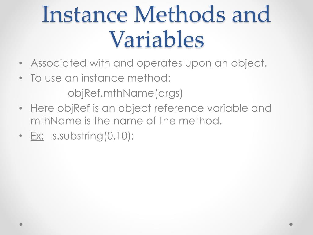 Instance Methods and Variables • Associated with and operates upon an object. • To use an instance method: objRef.mthName(args) • Here objRef is an object reference variable and mthName is the name of the method. • Ex: s.substring(0,10);