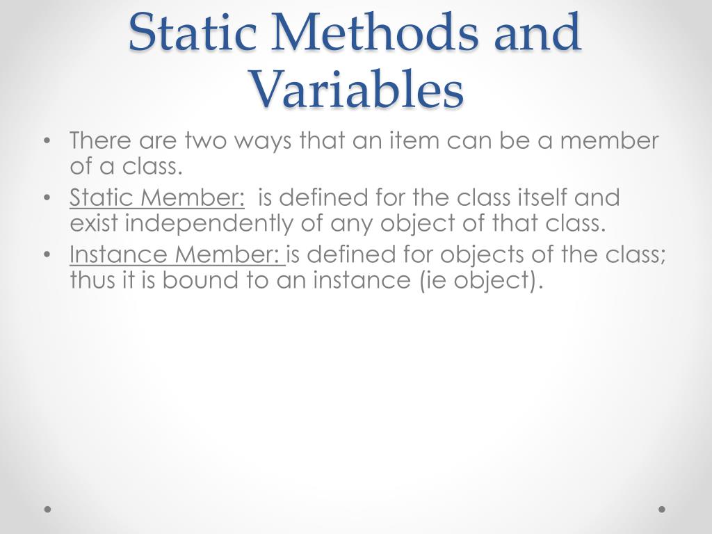 Static Methods and Variables • There are two ways that an item can be a member of a class. • Static Member: is defined for the class itself and exist independently of any object of that class. • Instance Member: is defined for objects of the class; thus it is bound to an instance (ie object).