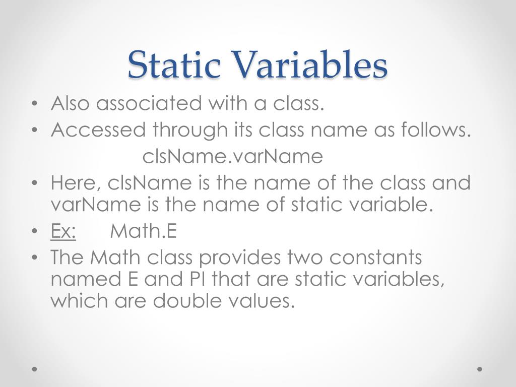 Static Variables • Also associated with a class. • Accessed through its class name as follows. clsName.varName • Here, clsName is the name of the class and varName is the name of static variable. • Ex: Math.E • The Math class provides two constants named E and PI that are static variables, which are double values.