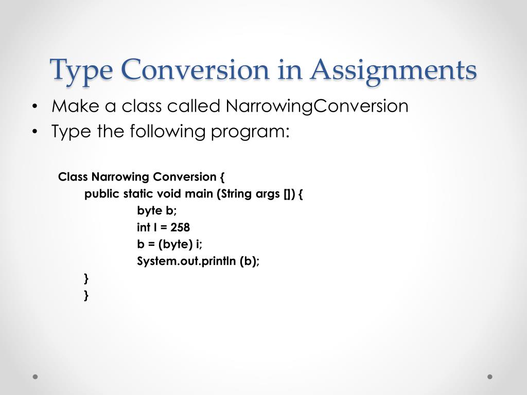 Type Conversion in Assignments • Make a class called NarrowingConversion • Type the following program: Class Narrowing Conversion { public static void main (String args []) { byte b; int I = 258 b = (byte) i; System.out.println (b); } }