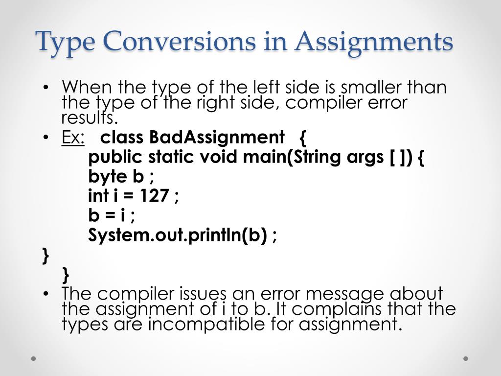 Type Conversions in Assignments • When the type of the left side is smaller than the type of the right side, compiler error results. • Ex:class BadAssignment { public static void main(String args [ ]) { byte b ; inti = 127 ; b = i ; System.out.println(b) ; } } • The compiler issues an error message about the assignment of i to b. It complains that the types are incompatible for assignment.