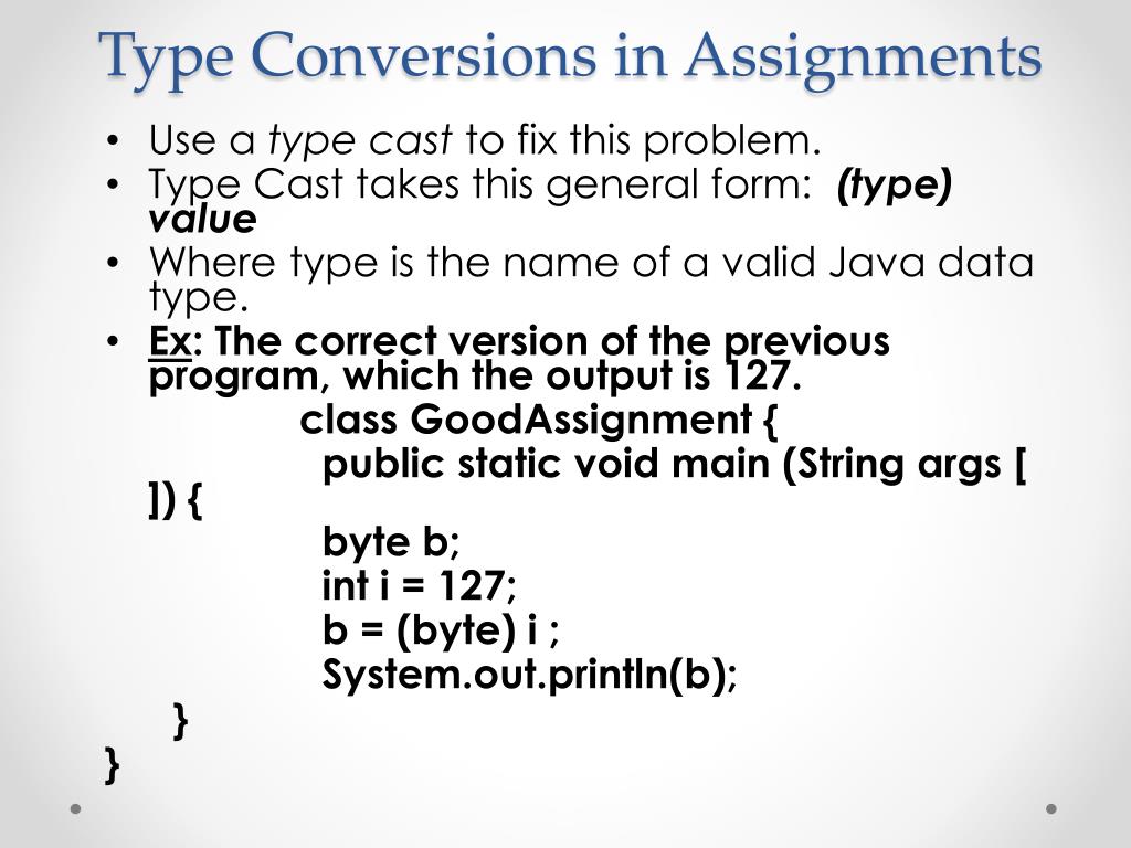 Type Conversions in Assignments • Use a type cast to fix this problem. • Type Cast takes this general form: (type) value • Where type is the name of a valid Java data type. • Ex: The correct version of the previous program, which the output is 127. class GoodAssignment { public static void main (String args [ ]) { byte b; inti = 127; b = (byte) i ; System.out.println(b); } }