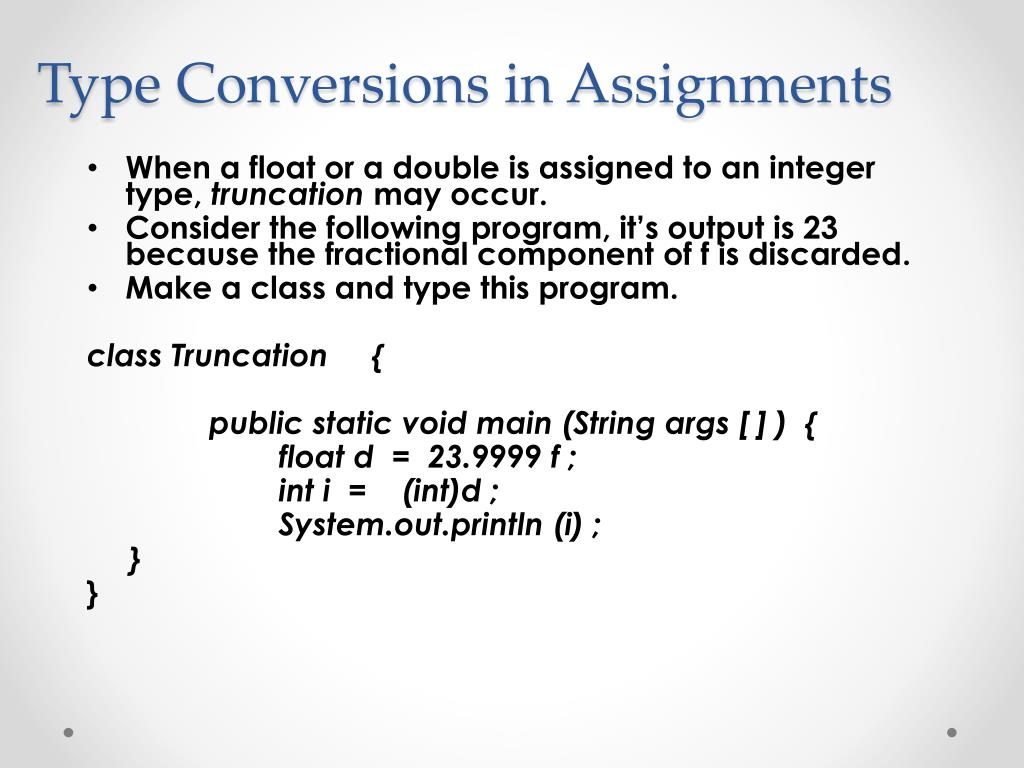 Type Conversions in Assignments • When a float or a double is assigned to an integer type, truncation may occur. • Consider the following program, it’s output is 23 because the fractional component of f is discarded. • Make a class and type this program. class Truncation { public static void main (String args [ ] ) { float d = 23.9999 f ; inti = (int)d ; System.out.println (i) ; } }