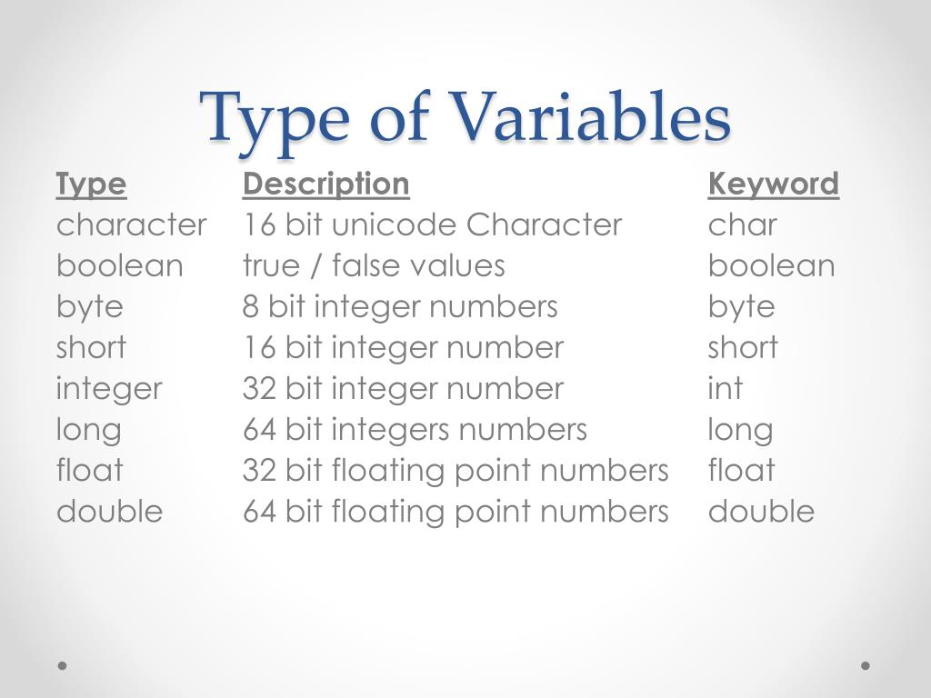 Type of Variables TypeDescriptionKeyword character 16 bit unicode Character char booleantrue / false values boolean byte 8 bit integer numbers byte short 16 bit integer number short integer 32 bit integer number int long 64 bit integers numbers long float 32 bit floating point numbers float double 64 bit floating point numbers double