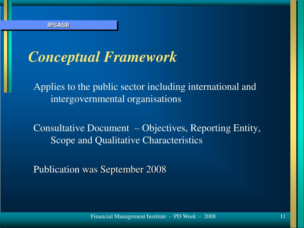 Conceptual Framework Applies to the public sector including international and intergovernmental organisations Consultative Document – Objectives, Reporting Entity, Scope and Qualitative Characteristics Publication was September 2008 Financial Management Institute - PD Week - 2008