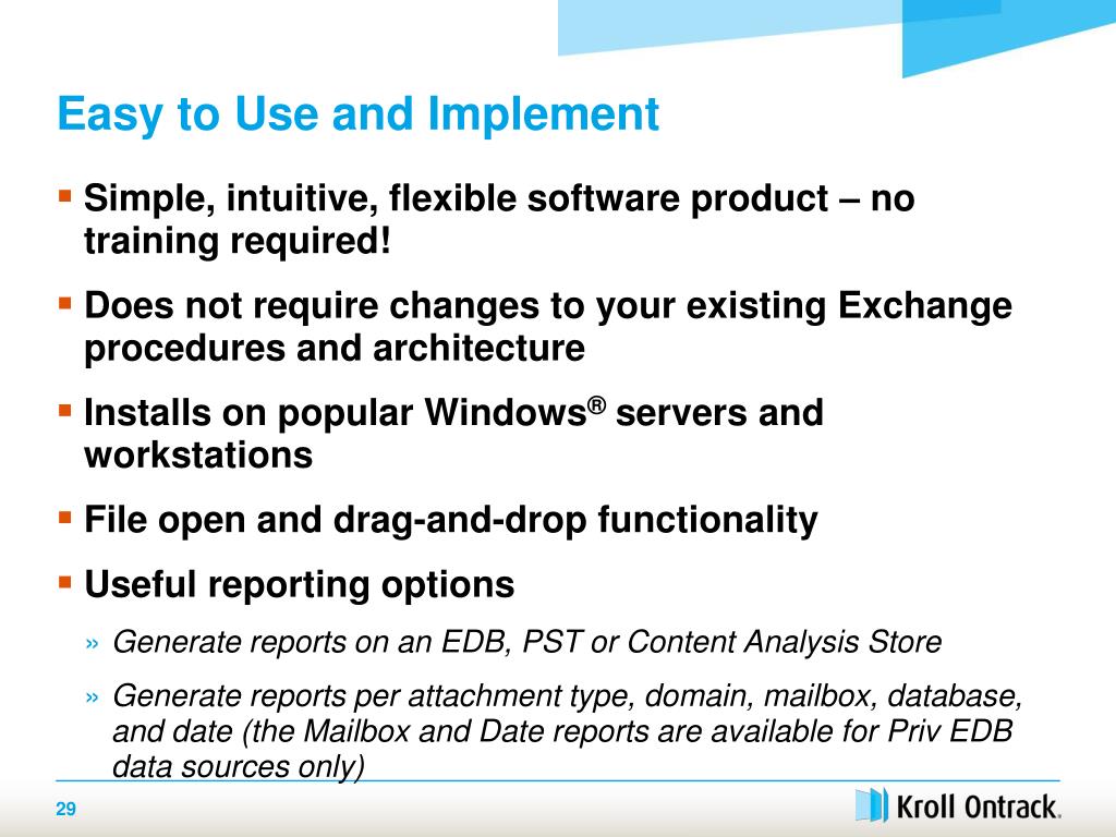Easy to Use and ImplementA Powerful Solution • Simple, intuitive, flexible software product – no training required! • Does not require changes to your existing Exchange procedures and architecture • Installs on popular Windows® servers and workstations • File open and drag-and-drop functionality • Useful reporting options • Generate reports on an EDB, PST or Content Analysis Store • Generate reports per attachment type, domain, mailbox, database, and date (the Mailbox and Date reports are available for Priv EDB data sources only)
