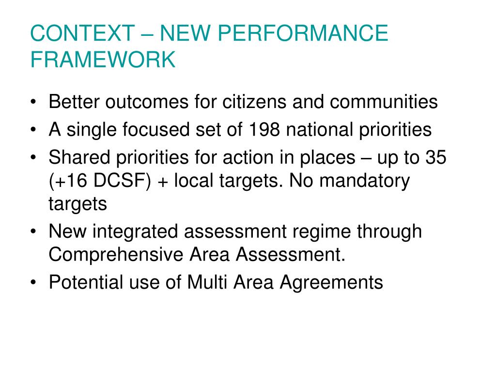 CONTEXT – NEW PERFORMANCE FRAMEWORK • Better outcomes for citizens and communities • A single focused set of 198 national priorities • Shared priorities for action in places – up to 35 (+16 DCSF) + local targets. No mandatory targets • New integrated assessment regime through Comprehensive Area Assessment. • Potential use of Multi Area Agreements