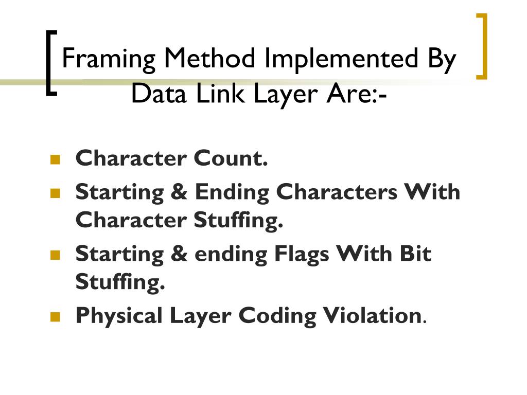 Framing Method Implemented By Data Link Layer Are:- • Character Count. • Starting & Ending Characters With Character Stuffing. • Starting & ending Flags With Bit Stuffing. • Physical Layer Coding Violation.