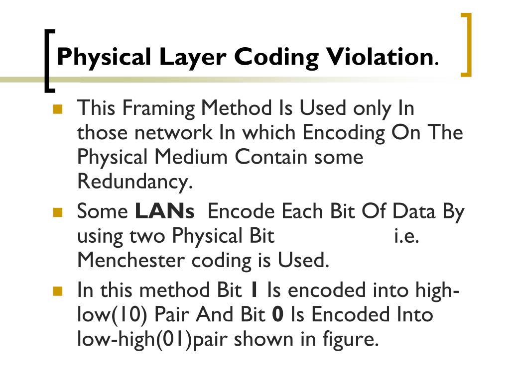 Physical Layer Coding Violation. • This Framing Method Is Used only In those network In which Encoding On The Physical Medium Contain some Redundancy. • Some LANs EncodeEach Bit Of DataBy using two Physical Bit i.e. Menchester coding is Used. • In this method Bit 1 Is encoded into high-low(10) Pair And Bit 0 Is Encoded Into low-high(01)pair shown in figure.