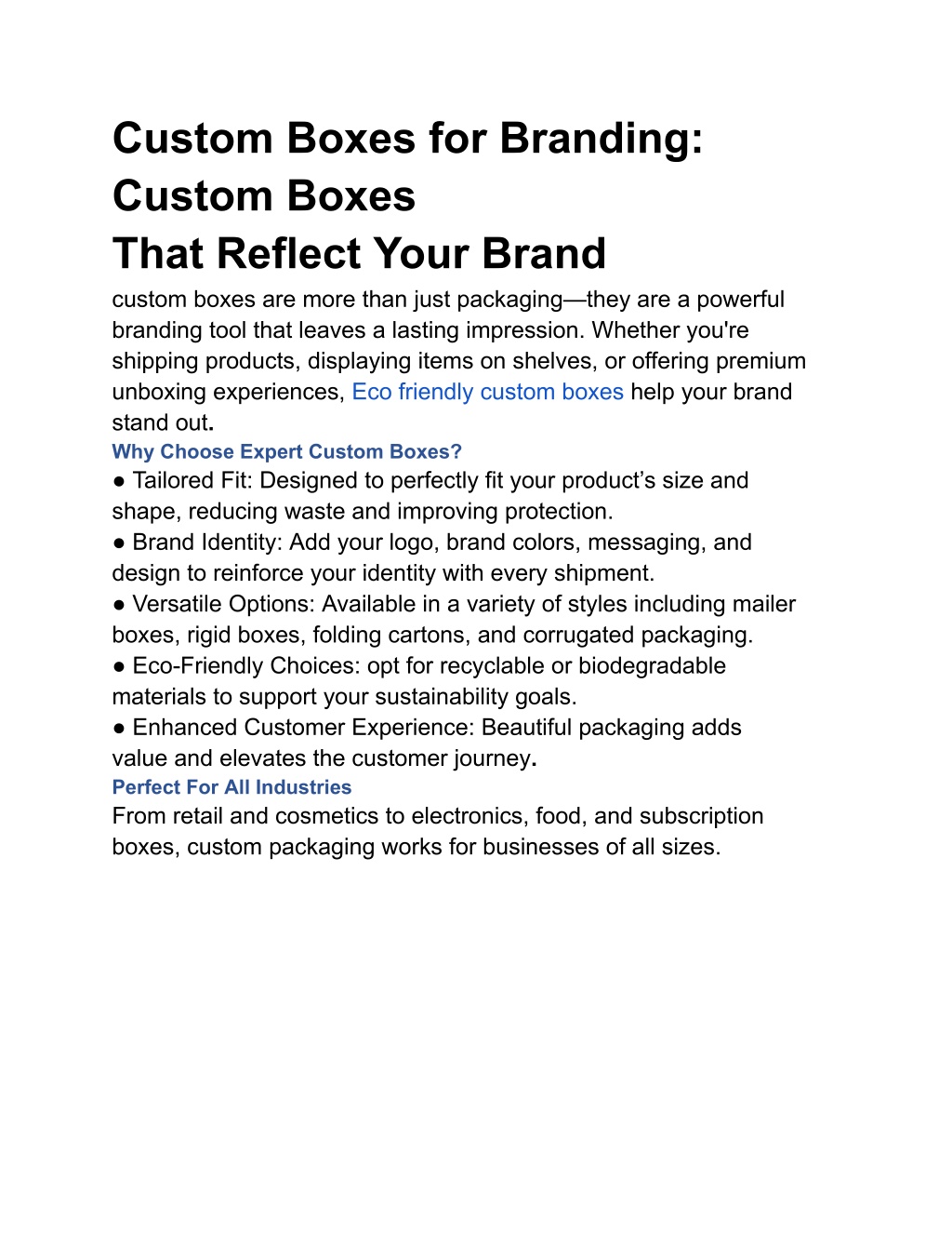 1. Custom Boxes for Branding: Custom Boxes That Reflect Your Brand custom boxes are more than just packaging—they are a powerful branding tool that leaves a lasting impression. Whether you're shipping products, displaying items on shelves, or offering premium unboxing experiences, Eco friendly custom boxes help your brand stand out. Why Choose Expert Custom Boxes? ● Tailored Fit: Designed to perfectly fit your product’s size and shape, reducing waste and improving protection. ● Brand Identity: Add your logo, brand colors, messaging, and design to reinforce your identity with every shipment. ● Versatile Options: Available in a variety of styles including mailer boxes, rigid boxes, folding cartons, and corrugated packaging. ● Eco-Friendly Choices: opt for recyclable or biodegradable materials to support your sustainability goals. ● Enhanced Customer Experience: Beautiful packaging adds value and elevates the customer journey. Perfect For All Industries From retail and cosmetics to electronics, food, and subscription boxes, custom packaging works for businesses of all sizes.