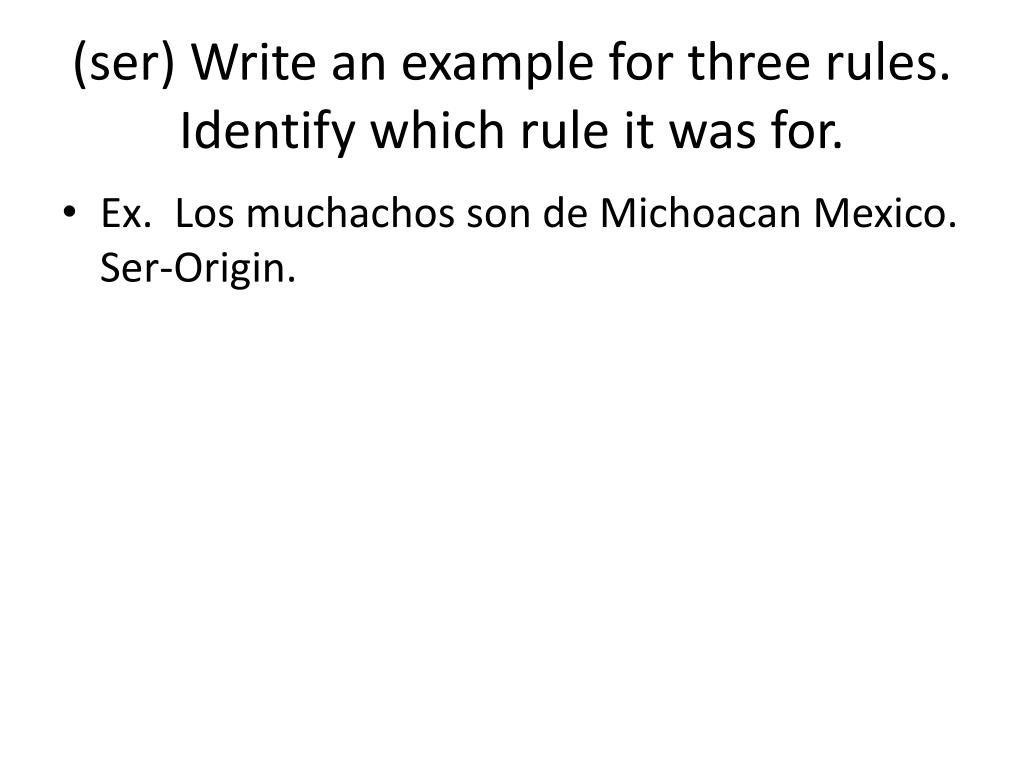 (ser) Write an example for three rules. Identify which rule it was for. • Ex. Los muchachos son de Michoacan Mexico. Ser-Origin.
