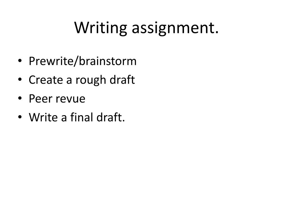 Writing assignment. • Prewrite/brainstorm • Create a rough draft • Peer revue • Write a final draft.