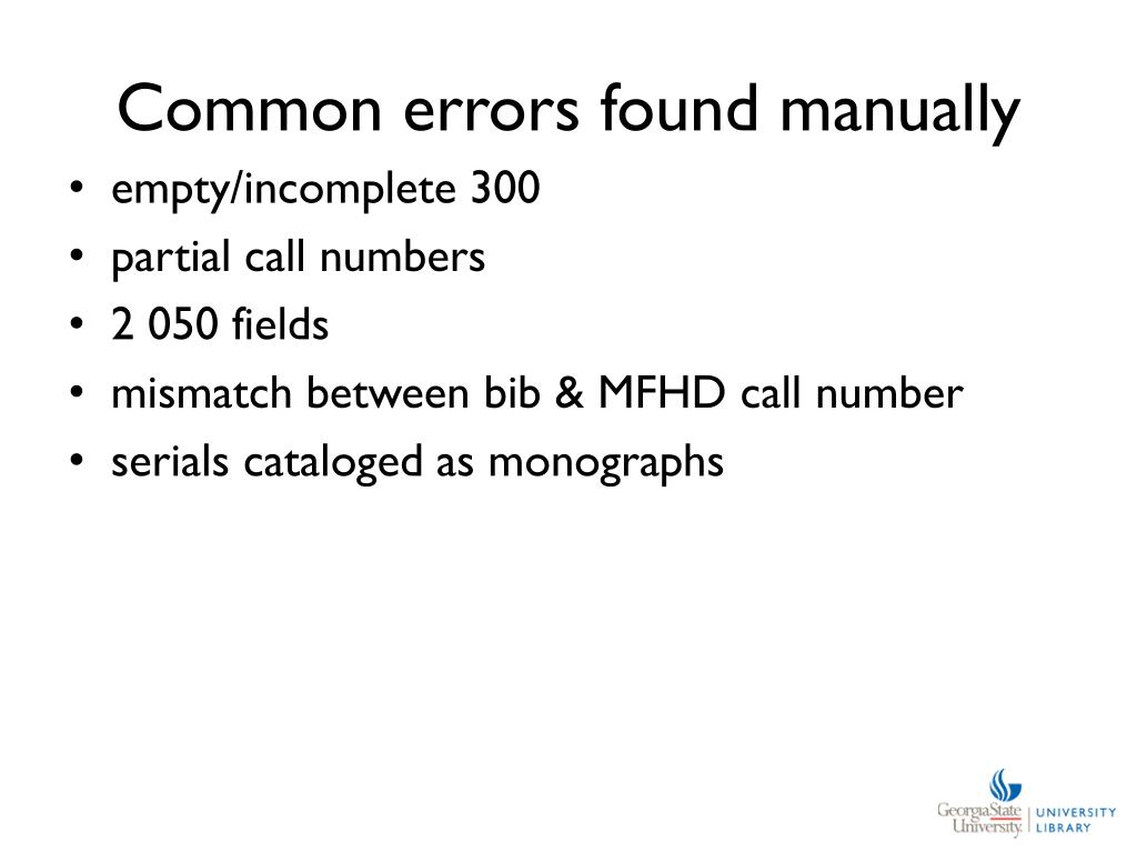 Common errors found manually • empty/incomplete 300 • partial call numbers • 2 050 fields • mismatch between bib & MFHD call number • serials cataloged as monographs
