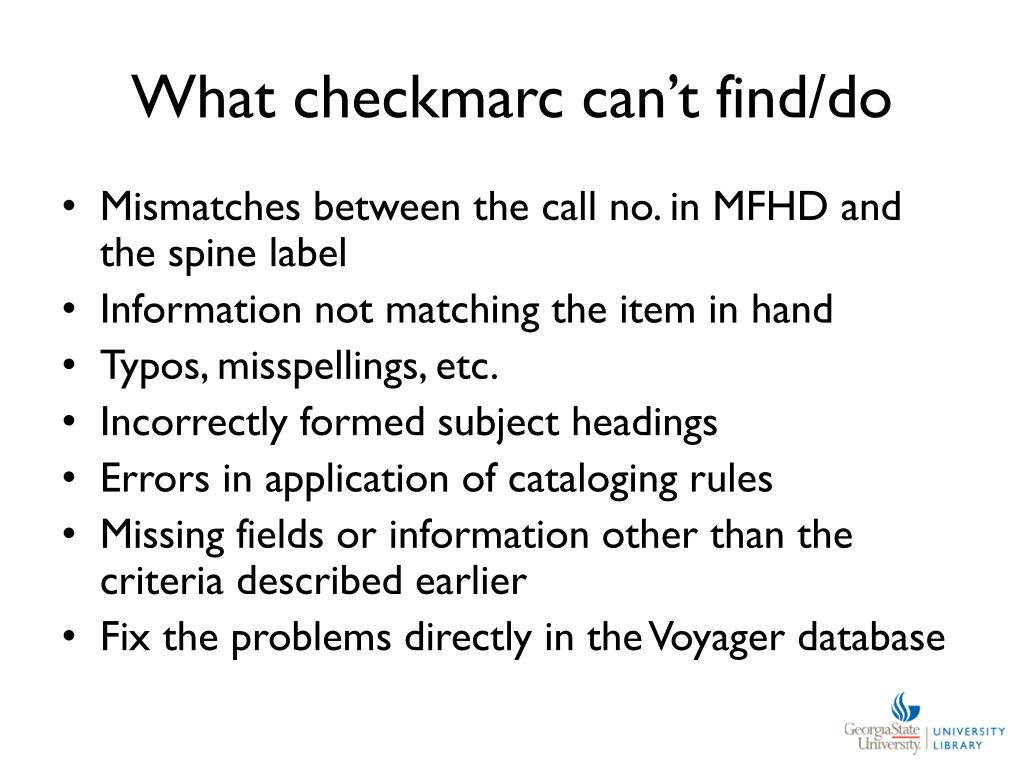 What checkmarc can’t find/do • Mismatches between the call no. in MFHD and the spine label • Information not matching the item in hand • Typos, misspellings, etc. • Incorrectly formed subject headings • Errors in application of cataloging rules • Missing fields or information other than the criteria described earlier • Fix the problems directly in the Voyager database