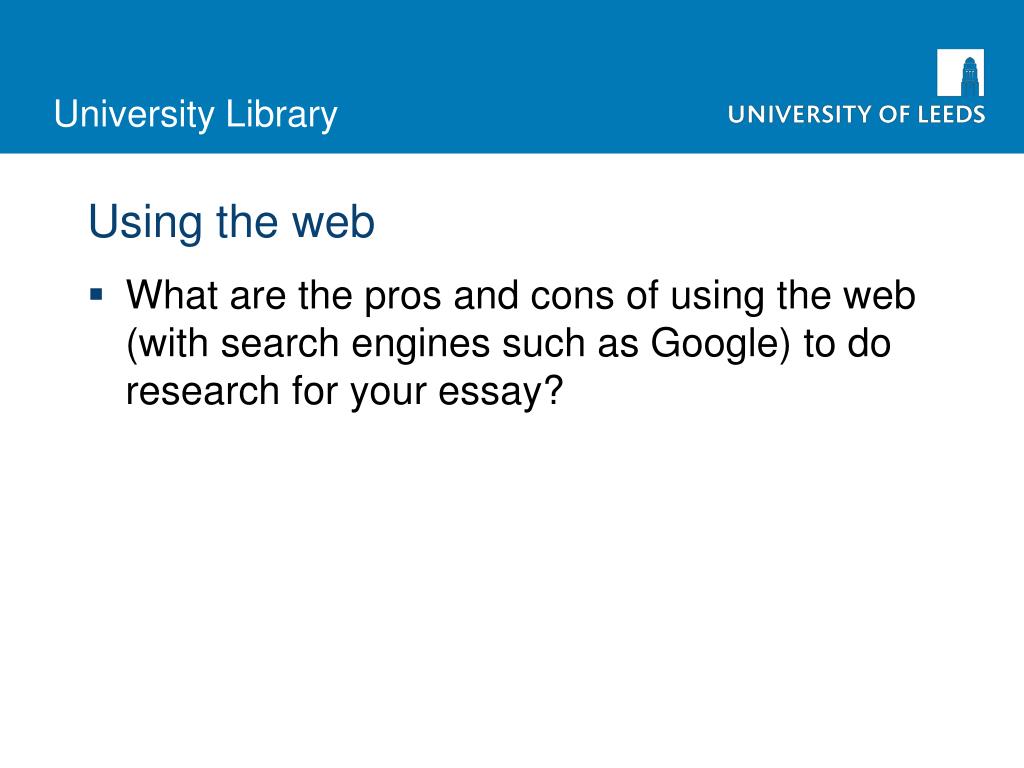 Using the web • What are the pros and cons of using the web (with search engines such as Google) to do research for your essay?