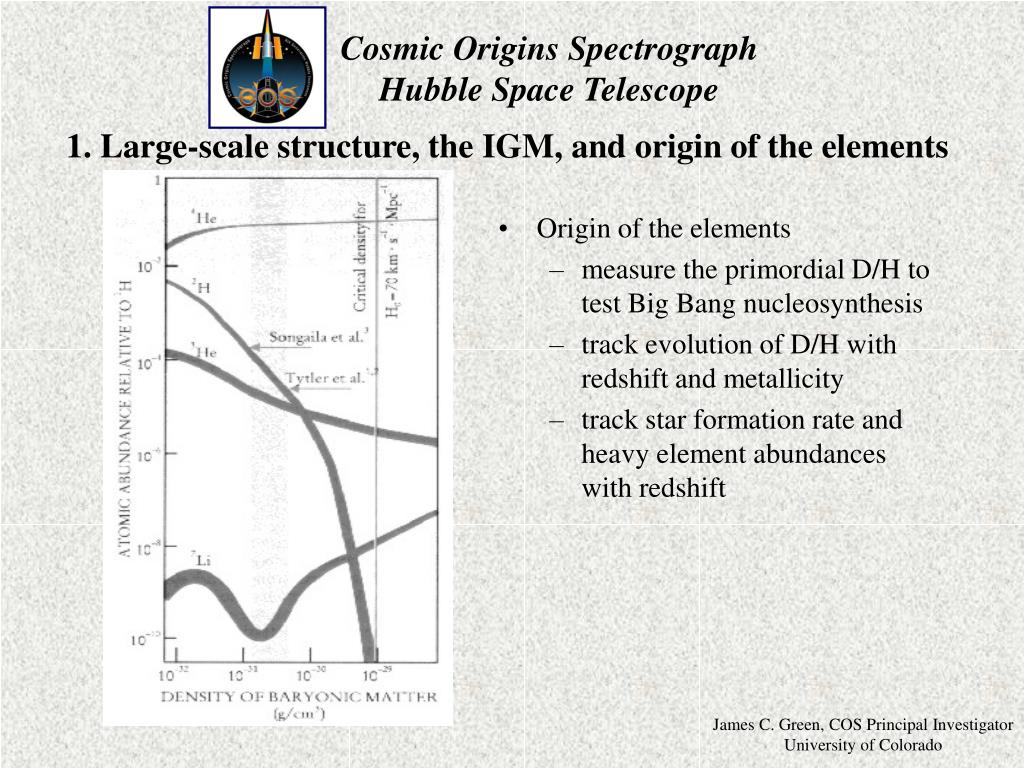 1. Large-scale structure, the IGM, and origin of the elements • Origin of the elements • measure the primordial D/H to test Big Bang nucleosynthesis • track evolution of D/H with redshift and metallicity • track star formation rate and heavy element abundances with redshift