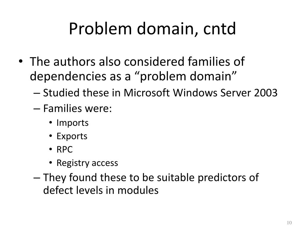Problem domain, cntd • The authors also considered families of dependencies as a “problem domain” • Studied these in Microsoft Windows Server 2003 • Families were: • Imports • Exports • RPC • Registry access • They found these to be suitable predictors of defect levels in modules
