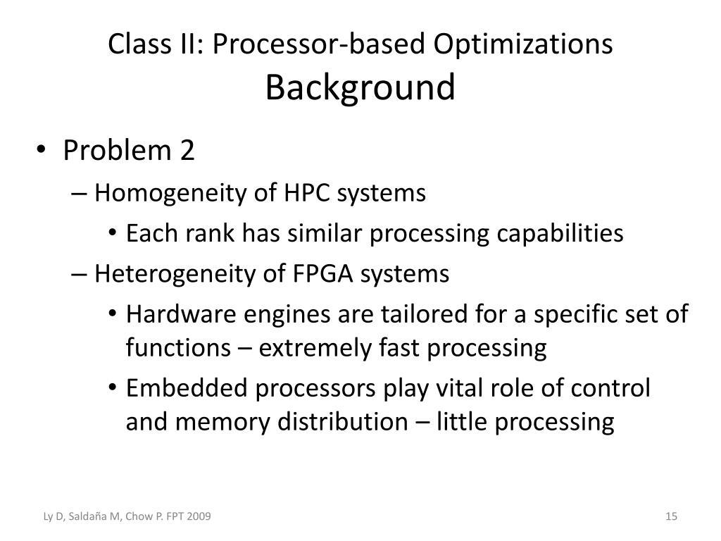 Class II: Processor-based OptimizationsBackground • Problem 2 • Homogeneity of HPC systems • Each rank has similar processing capabilities • Heterogeneity of FPGA systems • Hardware engines are tailored for a specific set of functions – extremely fast processing • Embedded processors play vital role of control and memory distribution – little processing