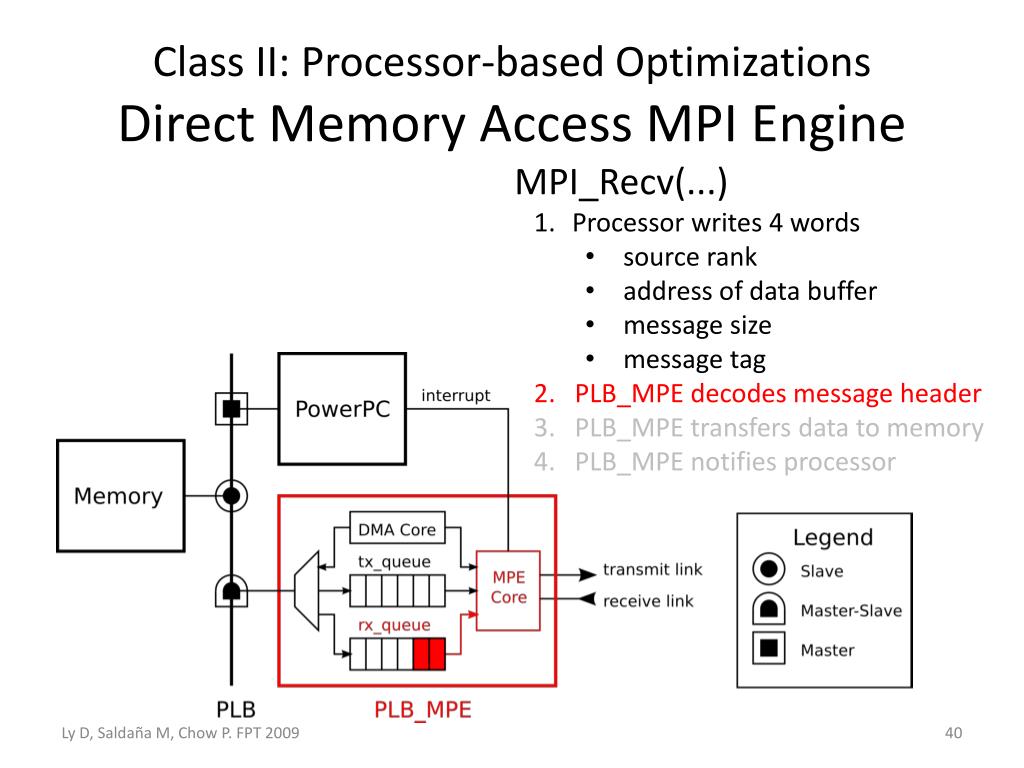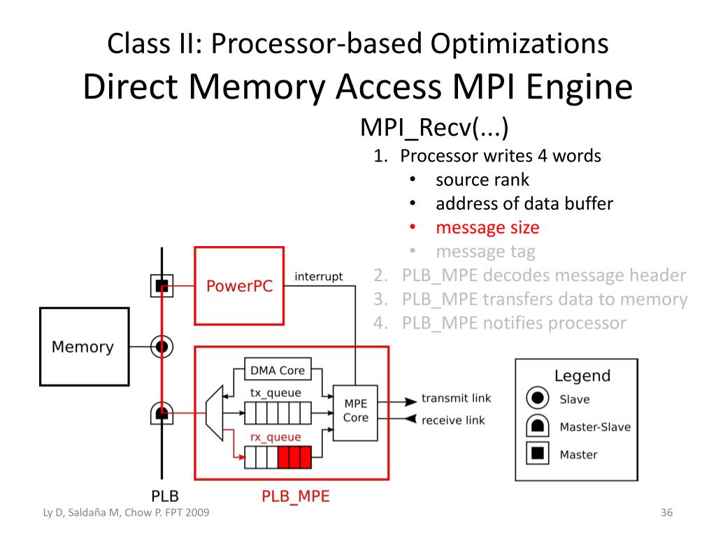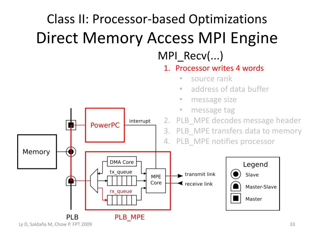 Class II: Processor-based OptimizationsDirect Memory Access MPI Engine • MPI_Recv(...) • Processor writes 4 words • source rank • address of data buffer • message size • message tag • PLB_MPE decodes message header • PLB_MPE transfers data to memory • PLB_MPE notifies processor