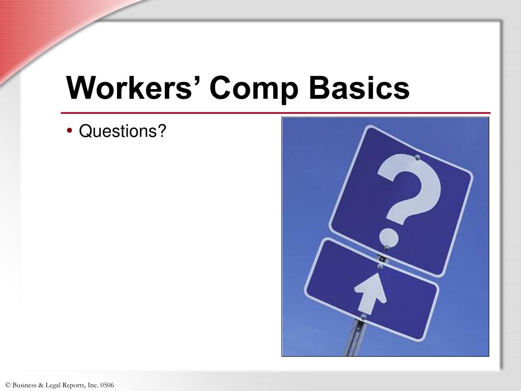 Session Outline • Workers’ comp, what it covers, and when it applies • Costs and special provisions • Claims and reporting requirements • Contact during leave and the return to work • Preventing workplace accidents