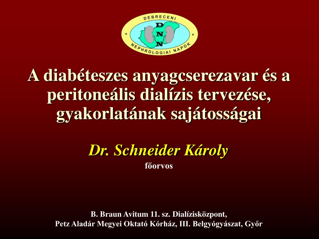 A diabéteszes anyagcserezavar és a peritoneális dialízis tervezése, gyakorlatának sajátosságai. Dr. Schneider Károly. főorvos. B. Braun Avitum 11. sz. Dialízisközpont, Petz Aladár Megyei Oktató Kórház, III. Belgyógyászat, Győr.