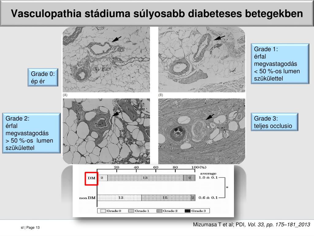 Vasculopathia stádiuma súlyosabb diabeteses betegekben Grade 1: érfal megvastagodás < 50 %-os lumen szükülettel Grade 0: ép ér Grade 2: érfal megvastagodás > 50 %-os lumen szükülettel Grade 3: teljes occlusio Mizumasa T et al; PDI, Vol. 33, pp. 175–181_2013