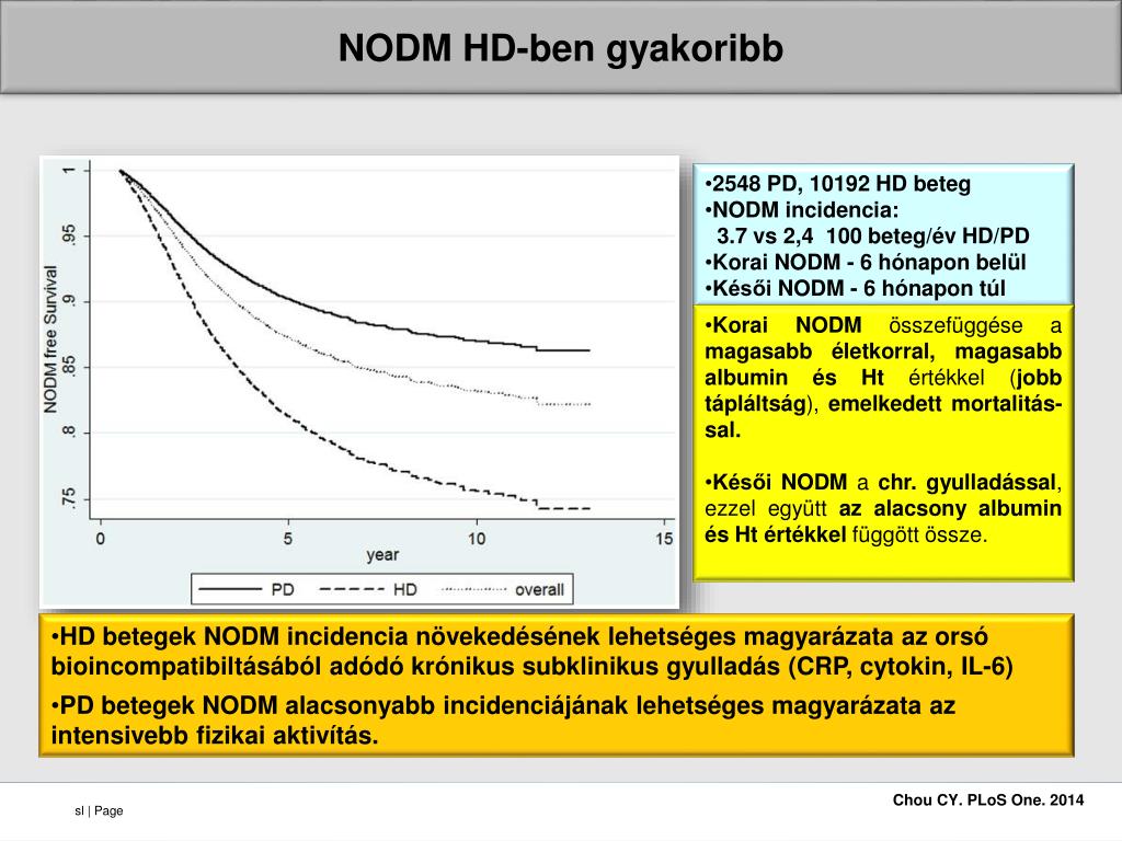 NODM HD-ben gyakoribb • 2548 PD, 10192 HD beteg • NODM incidencia: • 3.7 vs 2,4 100 beteg/év HD/PD • Korai NODM - 6 hónapon belül • Késői NODM - 6 hónapon túl • Korai NODM összefüggése a magasabb életkorral, magasabb albumin és Htértékkel (jobb tápláltság), emelkedett mortalitás-sal. • Késői NODM a chr. gyulladással, ezzel együtt az alacsony albumin és Ht értékkel függött össze. • HD betegek NODM incidencia növekedésének lehetséges magyarázata az orsó bioincompatibiltásából adódó krónikus subklinikus gyulladás (CRP, cytokin, IL-6) • PD betegek NODM alacsonyabb incidenciájának lehetséges magyarázata az intensivebb fizikai aktivítás. ChouCY. PLoSOne. 2014