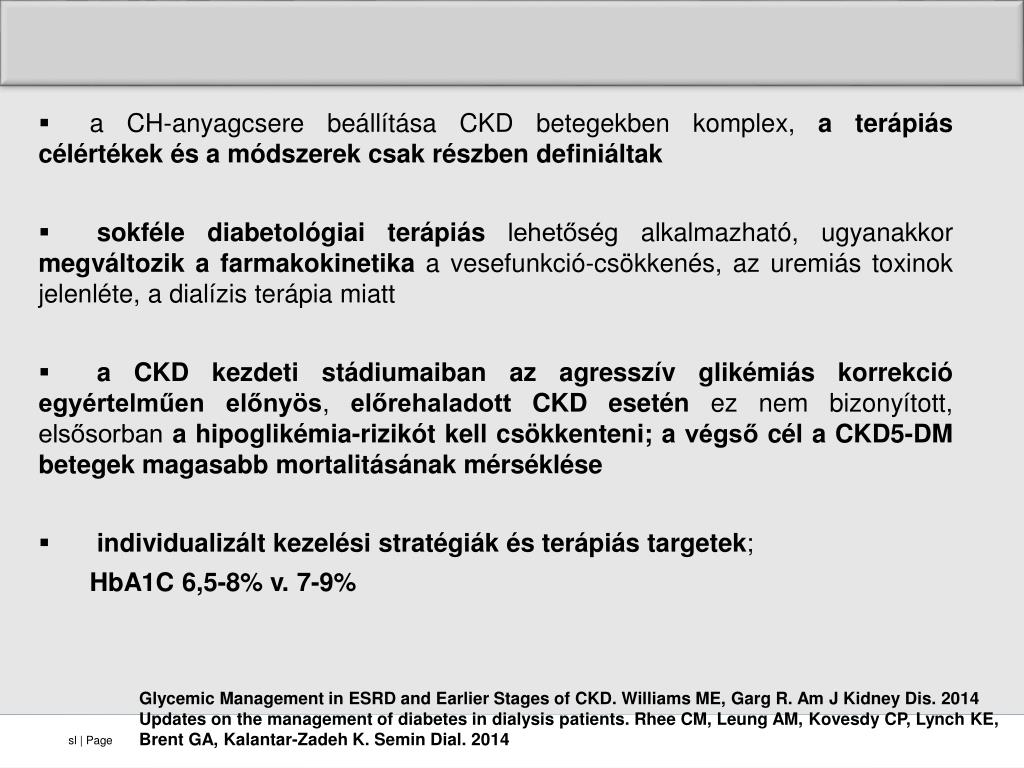 a CH-anyagcsere beállítása CKD betegekben komplex, a terápiás célértékek és a módszerek csak részben definiáltak • sokféle diabetológiai terápiás lehetőség alkalmazható, ugyanakkor megváltozik a farmakokinetikaa vesefunkció-csökkenés, az uremiás toxinok jelenléte, a dialízis terápia miatt • a CKD kezdeti stádiumaiban az agresszív glikémiás korrekció egyértelműen előnyös, előrehaladott CKD esetén ez nem bizonyított, elsősorban a hipoglikémia-rizikót kell csökkenteni; a végső cél a CKD5-DM betegek magasabb mortalitásának mérséklése • individualizált kezelési stratégiák és terápiás targetek; • HbA1C 6,5-8% v. 7-9% Glycemic Management in ESRD and Earlier Stages of CKD. Williams ME, Garg R. Am J Kidney Dis. 2014 Updates on the management of diabetes in dialysis patients. Rhee CM, Leung AM, Kovesdy CP, Lynch KE, Brent GA, Kalantar-Zadeh K.Semin Dial. 2014