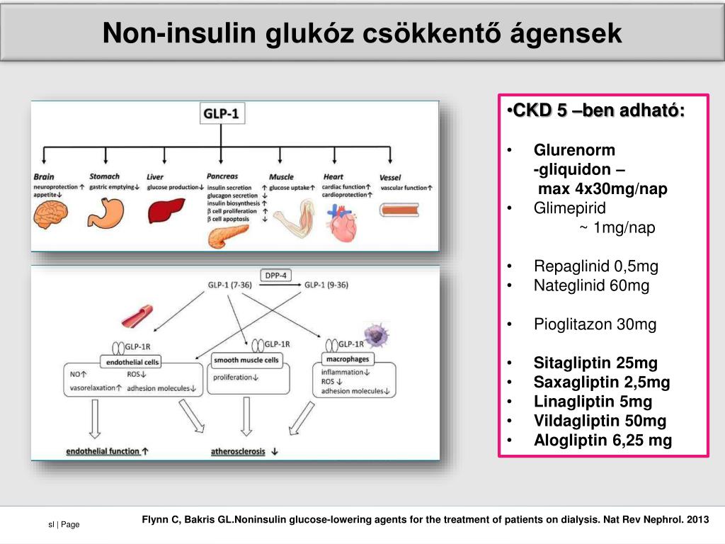 Non-insulin glukóz csökkentő ágensek • CKD 5 –ben adható: • Glurenorm • -gliquidon – • max4x30mg/nap • Glimepirid • ~ 1mg/nap • Repaglinid0,5mg • Nateglinid60mg • Pioglitazon30mg • Sitagliptin25mg • Saxagliptin 2,5mg • Linagliptin5mg • Vildagliptin 50mg • Alogliptin6,25 mg Flynn C, BakrisGL.Noninsulinglucose-loweringagentsforthetreatment of patientsondialysis. NatRevNephrol. 2013