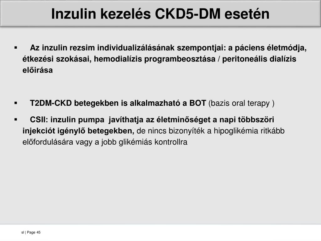 Inzulin kezelés CKD5-DM esetén • Az inzulin rezsim individualizálásának szempontjai: a páciens életmódja, étkezési szokásai, hemodialízis programbeosztása / peritoneális dialízis előirása • T2DM-CKD betegekben is alkalmazható a BOT (bazisoralterapy ) • CSII: inzulin pumpa javíthatja az életminőséget a napi többszöri injekciót igénylő betegekben, de nincs bizonyíték a hipoglikémia ritkább előfordulására vagy a jobb glikémiás kontrollra