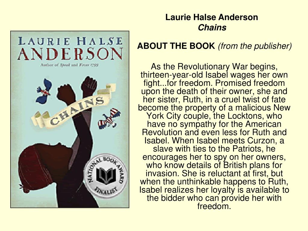 Laurie Halse AndersonChains ABOUT THE BOOK (from the publisher) As the Revolutionary War begins, thirteen-year-old Isabel wages her own fight...for freedom. Promised freedom upon the death of their owner, she and her sister, Ruth, in a cruel twist of fate become the property of a malicious New York City couple, the Locktons, who have no sympathy for the American Revolution and even less for Ruth and Isabel. When Isabel meets Curzon, a slave with ties to the Patriots, he encourages her to spy on her owners, who know details of British plans for invasion. She is reluctant at first, but when the unthinkable happens to Ruth, Isabel realizes her loyalty is available to the bidder who can provide her with freedom.