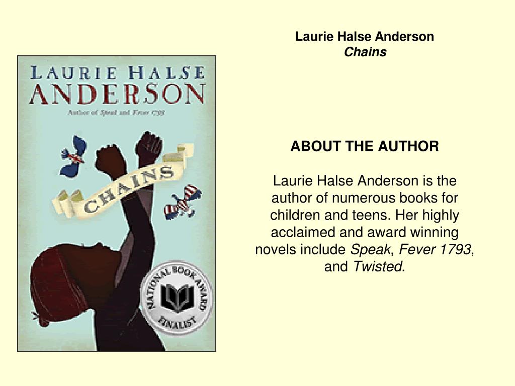 Laurie Halse AndersonChains ABOUT THE AUTHOR Laurie Halse Anderson is the author of numerous books for children and teens. Her highly acclaimed and award winning novels include Speak, Fever 1793, and Twisted.