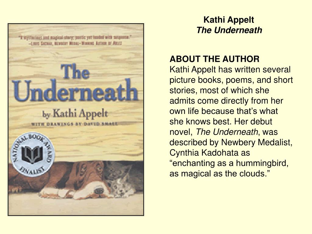 Kathi AppeltThe Underneath ABOUT THE AUTHOR Kathi Appelt has written several picture books, poems, and short stories, most of which she admits come directly from her own life because that’s what she knows best. Her debut novel, The Underneath, was described by Newbery Medalist, Cynthia Kadohata as “enchanting as a hummingbird, as magical as the clouds.”