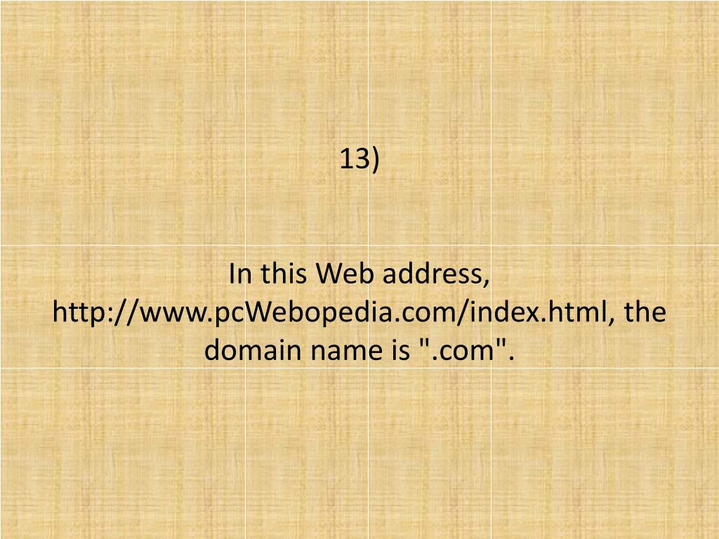 13) In this Web address, http://www.pcWebopedia.com/index.html, the domain name is ".com".