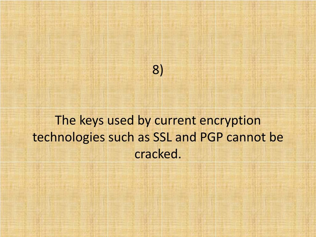 8) The keys used by current encryption technologies such as SSL and PGP cannot be cracked.