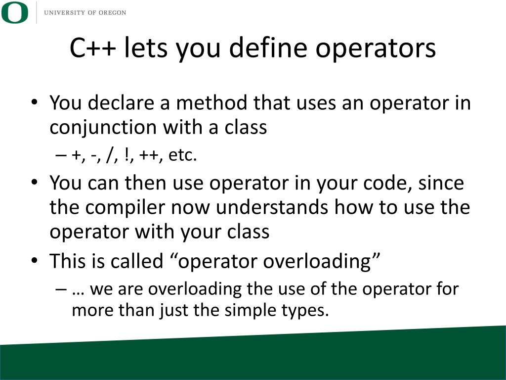 C++ lets you define operators • You declare a method that uses an operator in conjunction with a class • +, -, /, !, ++, etc. • You can then use operator in your code, since the compiler now understands how to use the operator with your class • This is called “operator overloading” • … we are overloading the use of the operator for more than just the simple types.