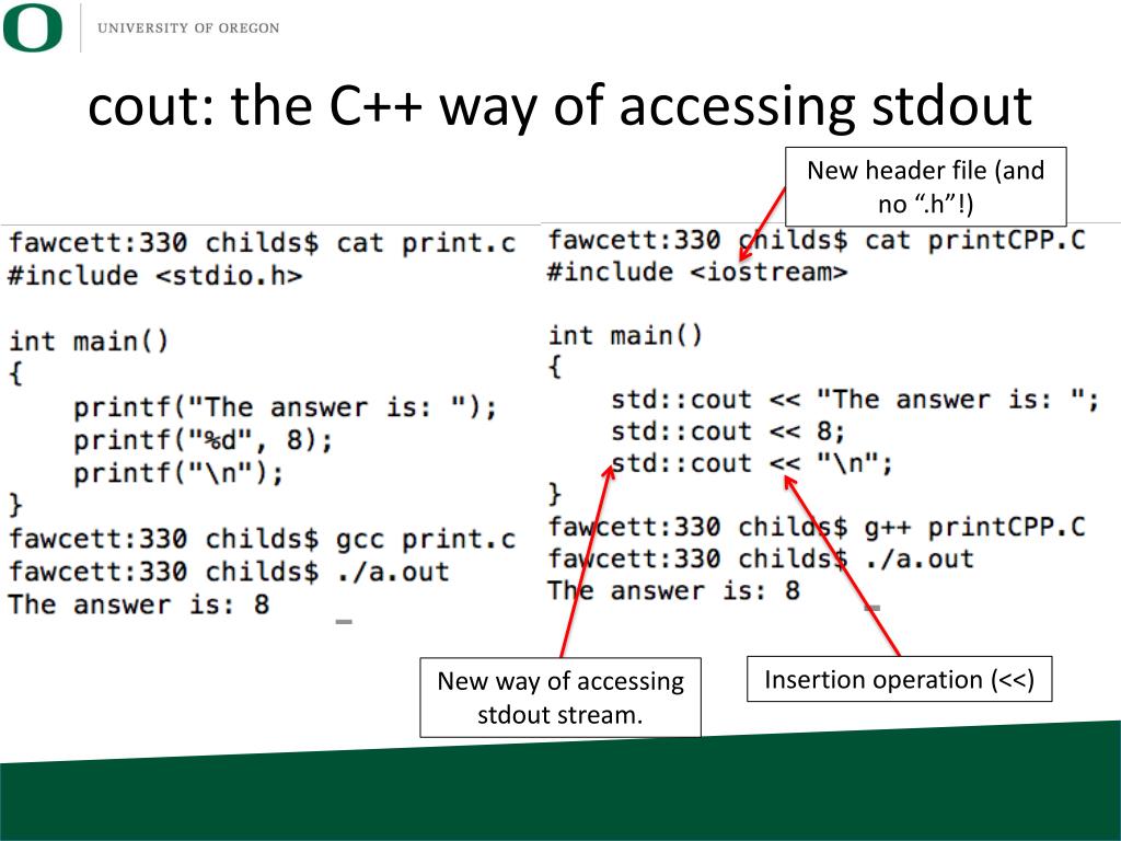 cout: the C++ way of accessing stdout New header file (and no “.h”!) New way of accessing stdout stream. Insertion operation (<<)