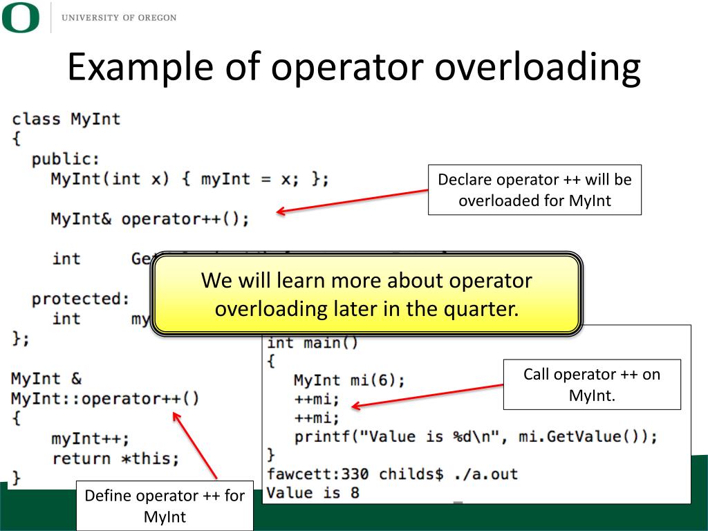 Example of operator overloading We will learn more about operator overloading later in the quarter. Declare operator ++ will be overloaded for MyInt Call operator ++ on MyInt. Define operator ++ for MyInt
