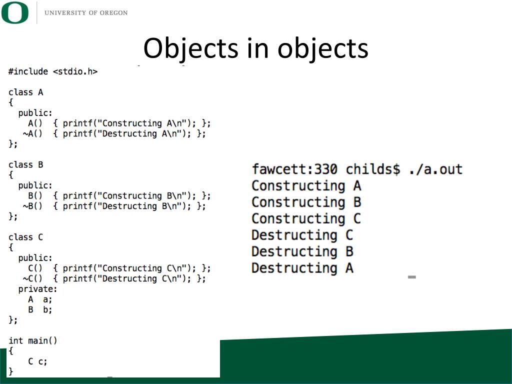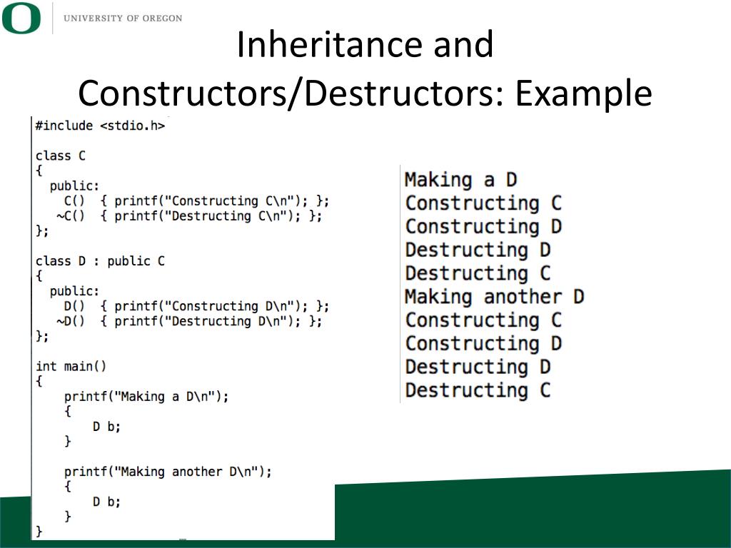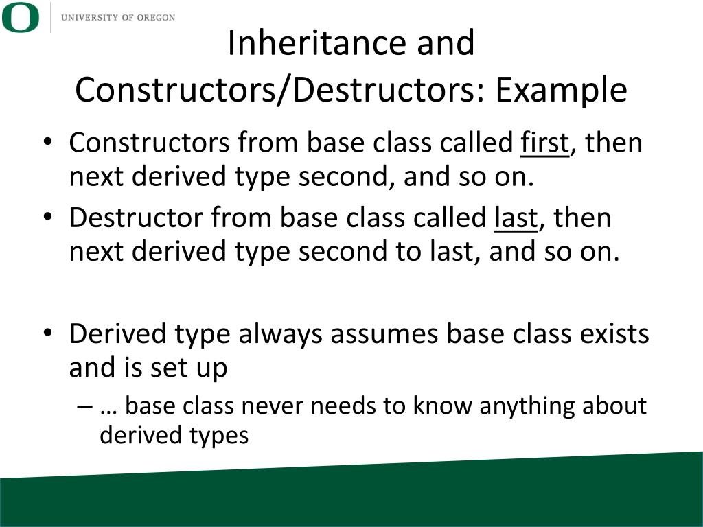 Inheritance and Constructors/Destructors: Example • Constructors from base class called first, then next derived type second, and so on. • Destructor from base class called last, then next derived type second to last, and so on. • Derived type always assumes base class exists and is set up • … base class never needs to know anything about derived types